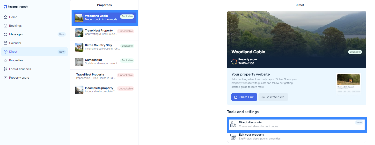 - Log in to your Travelnest account, click the Direct tab, and our platform will take you straight to your Direct Booking page.