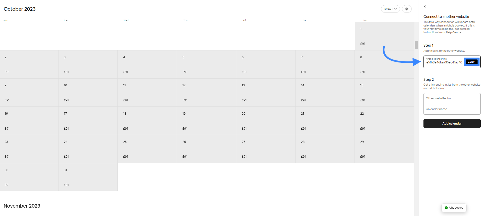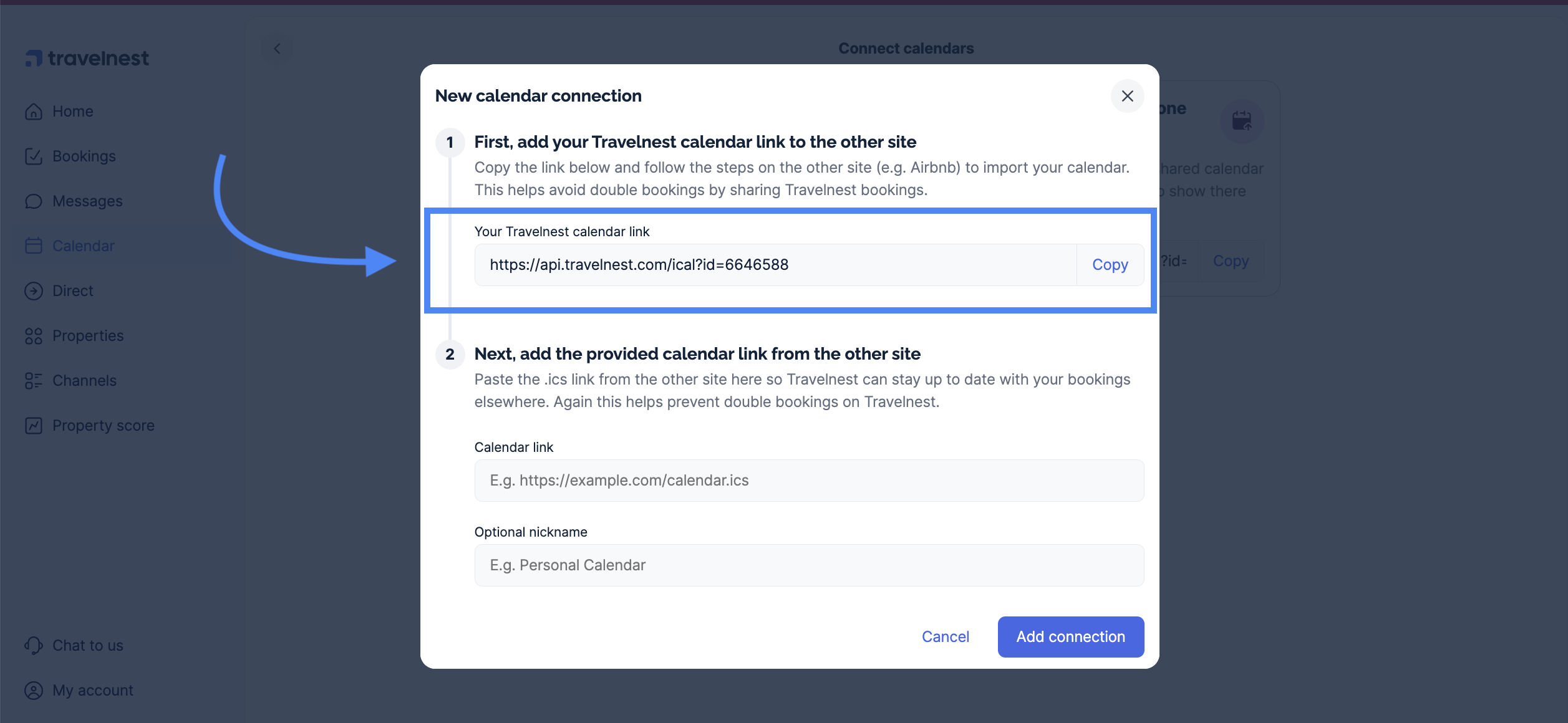 - Once you've pasted the Travelnest calendar, it's now time to export your Airbnb calendar to Travelnest. Still in Airbnb, under the same Connect calendars section, click Copy link to export your Airbnb calendar.