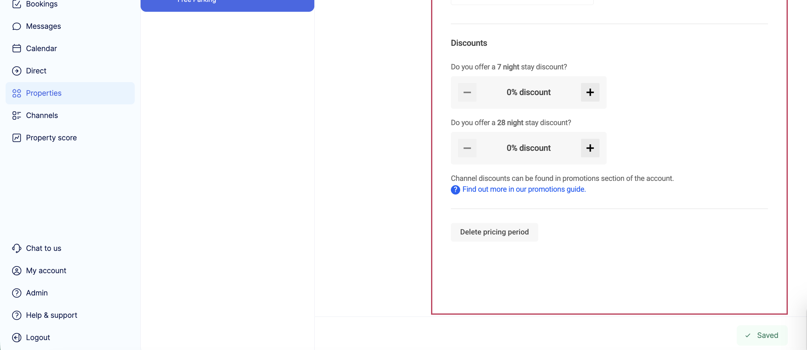 - On this page, scroll down to the section showing discounts for 7- and 28-night stays. Here, you can adjust the discount amounts as needed, and any changes will be saved automatically.