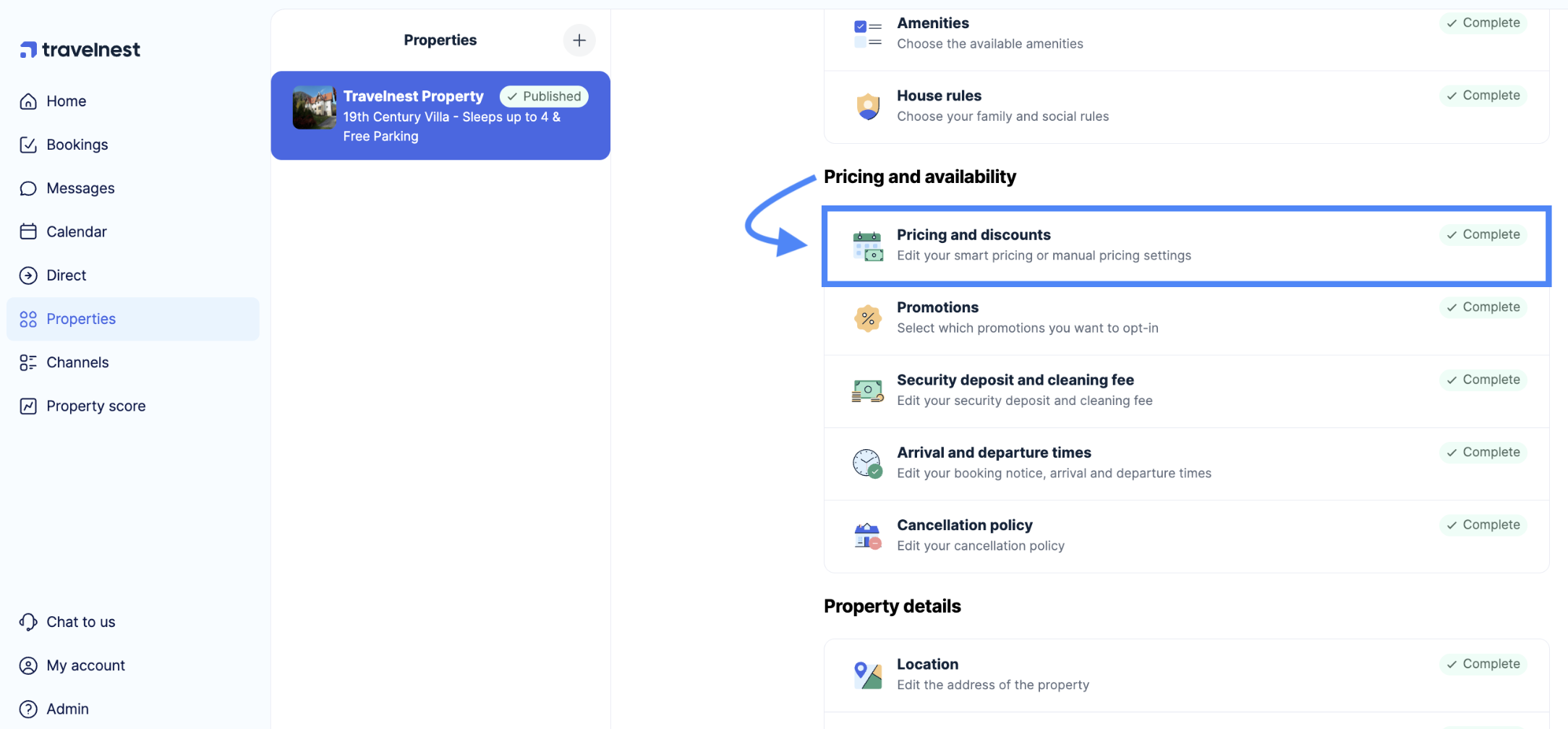 - Select the property and navigate to Pricing and availability, then click Pricing and discounts.