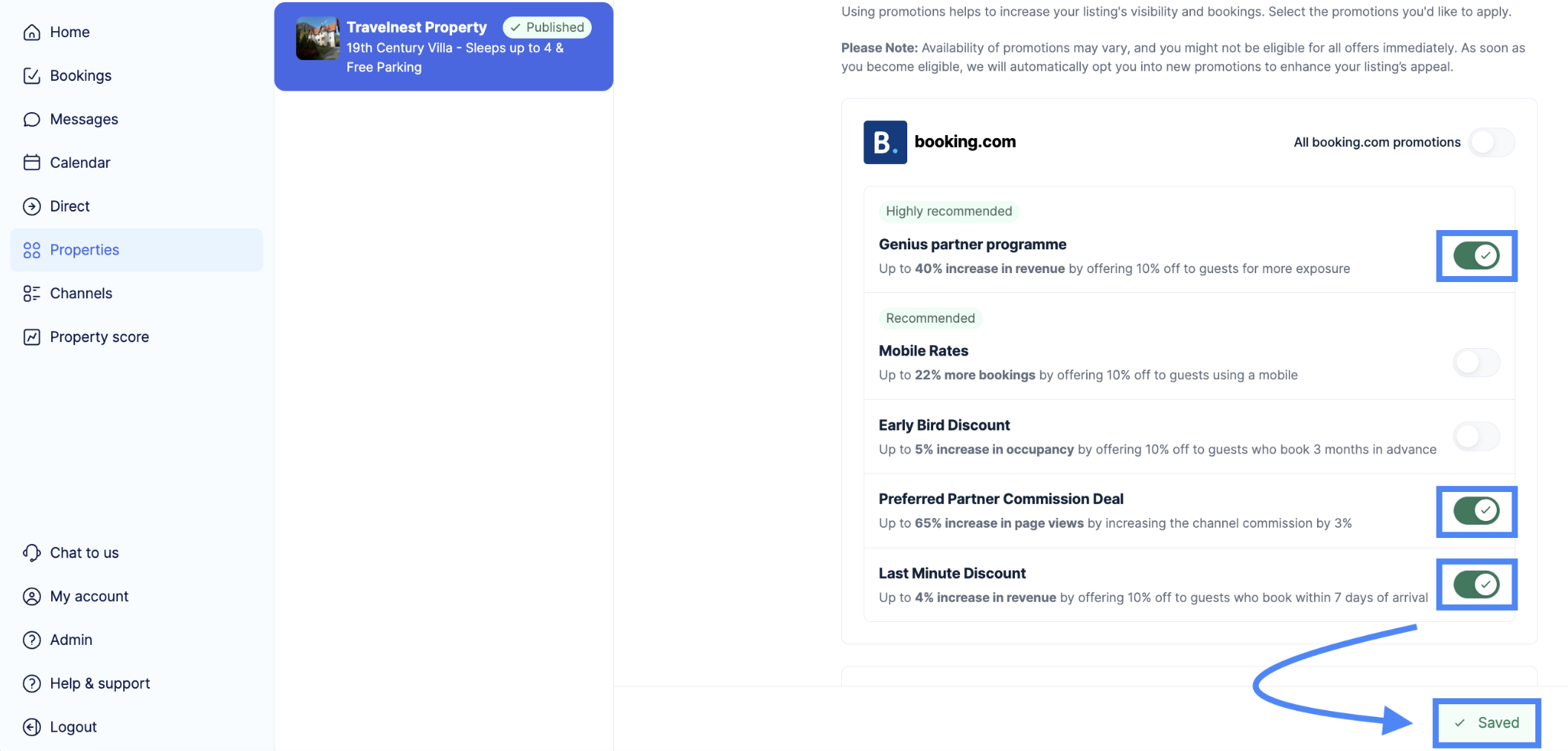 - In this section, you can explore all available promotions for Booking.com and Airbnb. To activate one, simply tick the box beside it and click Save changes. To remove a promotion, untick the box at any time.