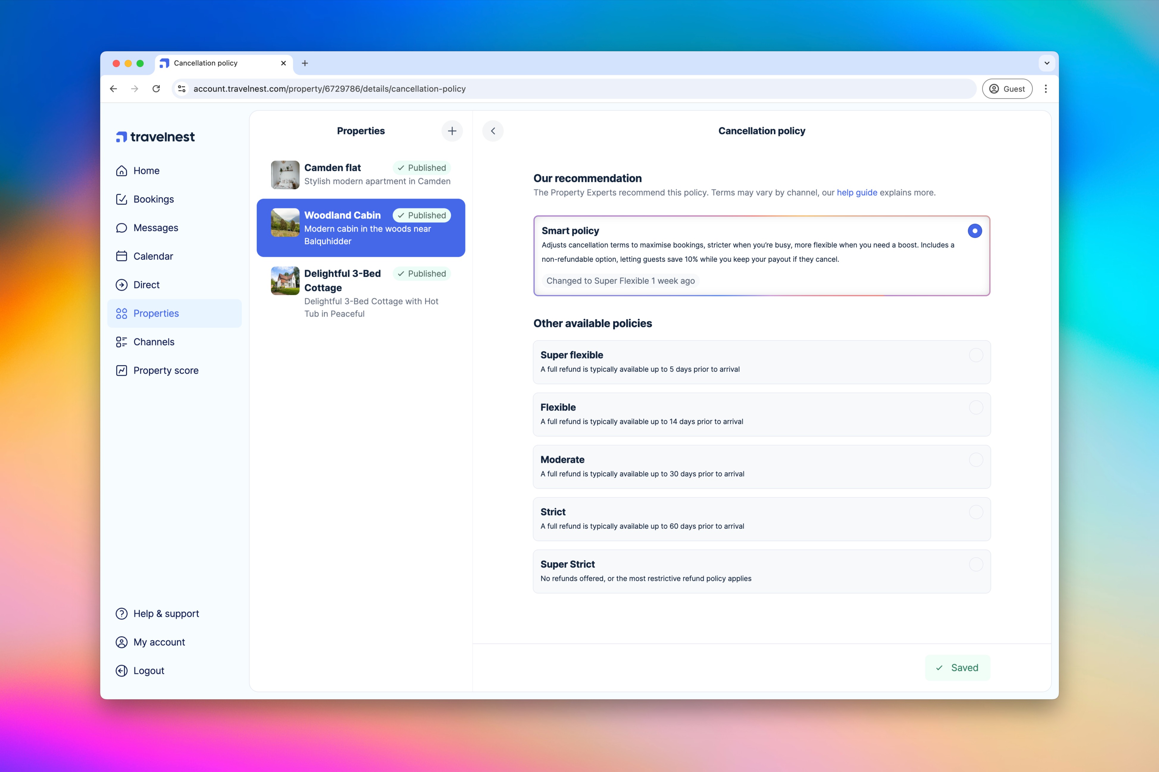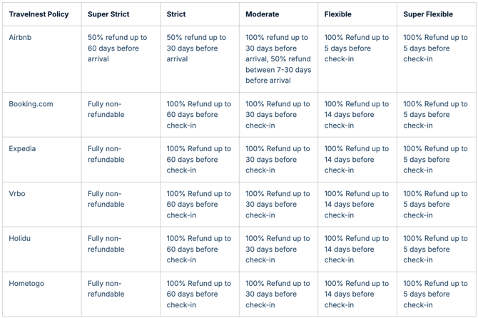 Choosing the right cancellation policy is key to striking the perfect balance between encouraging bookings and reducing last-minute cancellations. At Travelnest, we offer a range of policies tailored to suit your needs. Each policy maps to different refund conditions across major booking channels, including Airbnb, Booking.com, Expedia, Vrbo, Holidu, and Hometogo.