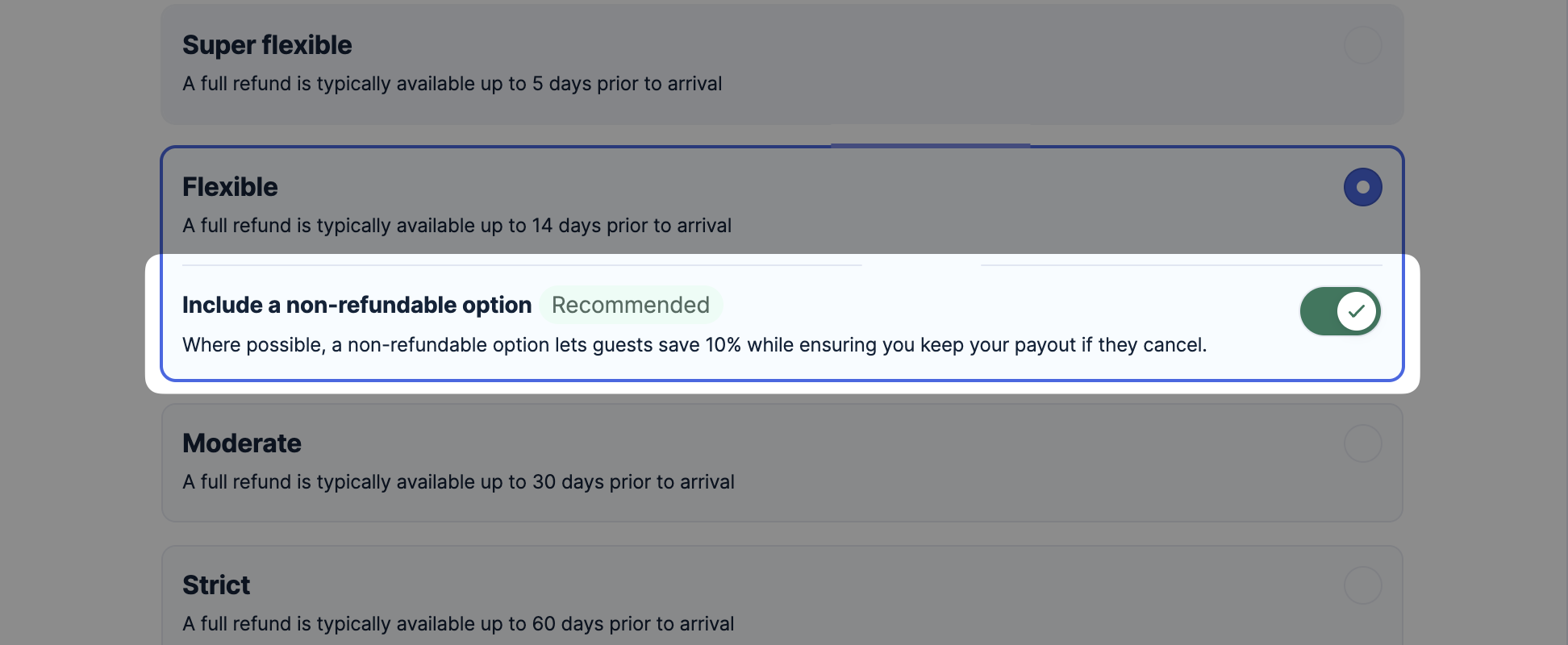 For added flexibility, you can also offer a non-refundable rate, giving guests a discount while ensuring you still receive a guaranteed payout if they cancel.
